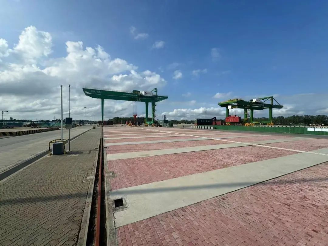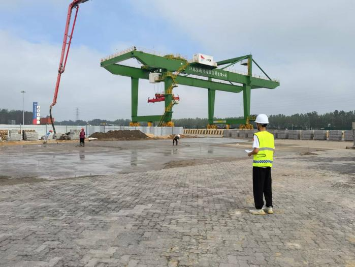 “紅花當(dāng)然配綠葉”。在高質(zhì)量、高標(biāo)準(zhǔn)完成該項(xiàng)目的同時(shí),集團(tuán)總工辦與陸港項(xiàng)目團(tuán)隊(duì)在細(xì)節(jié)處亦是別具匠心,為集裝箱堆場(chǎng)中新增的門(mén)式吊機(jī)進(jìn)行了新的綠色涂裝。平整堅(jiān)實(shí)的紅色堆場(chǎng)與高大可靠的綠色門(mén)機(jī)在藍(lán)天白云的映襯下不但展示了鹽城港人建設(shè)美麗港口的初心使命;也展現(xiàn)出了鹽城港人大膽的創(chuàng)新精神和在項(xiàng)目施工上精益求精的專(zhuān)業(yè)素養(yǎng)。
