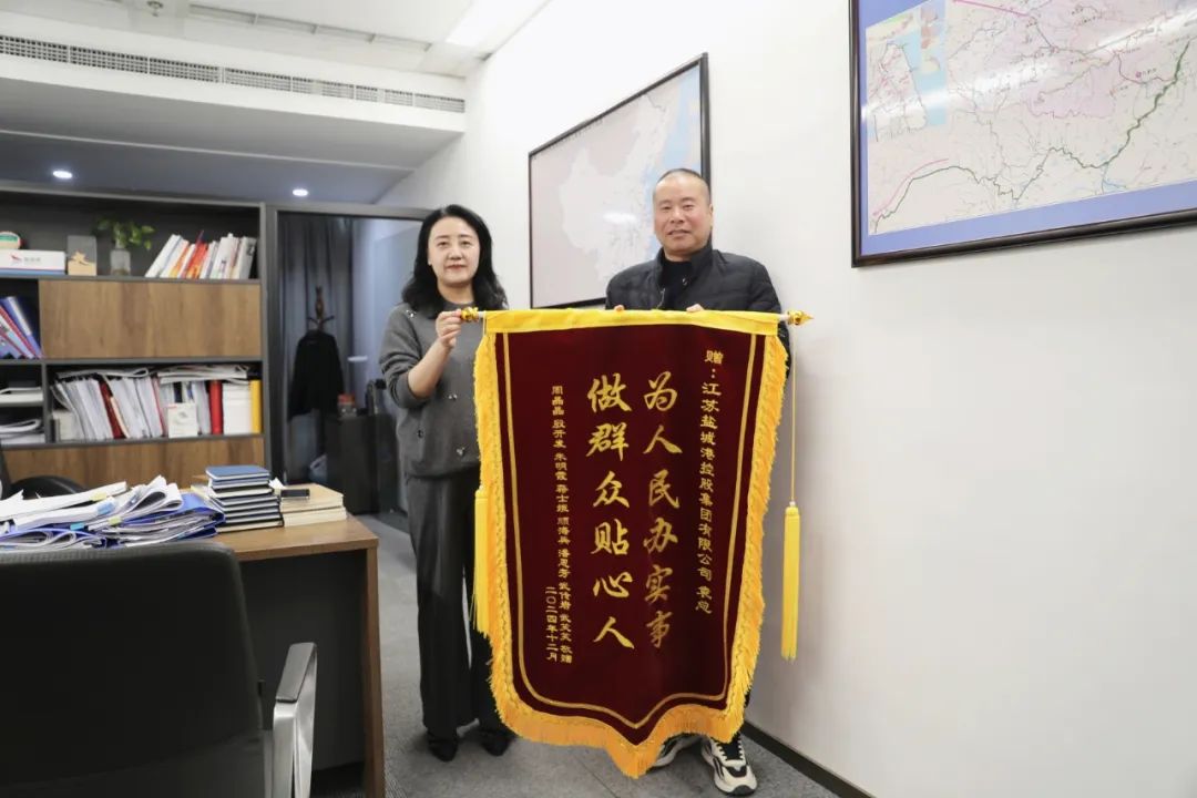 12月24日,多名群眾自發(fā)將一面寫有“為人民辦實(shí)事 做群眾貼心人”的錦旗送到鹽城港集團(tuán),感謝鹽城港集團(tuán)副總經(jīng)理袁欣帶領(lǐng)團(tuán)隊(duì)幫助民眾解難題、辦實(shí)事。