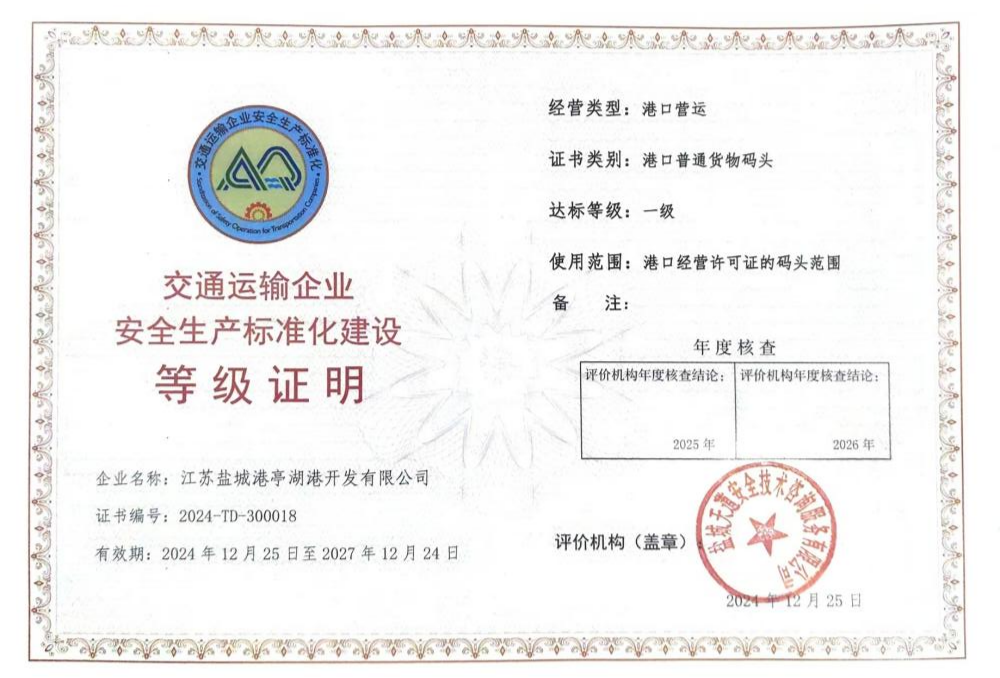近日,陸港集團亭湖港區(qū)順利通過交通運輸企業(yè)安全生產(chǎn)一級標(biāo)準(zhǔn)化驗收,并取得一級標(biāo)準(zhǔn)化認(rèn)證證書。這標(biāo)志著陸港集團在內(nèi)河港區(qū)安全生產(chǎn)管理方面邁上新臺階。