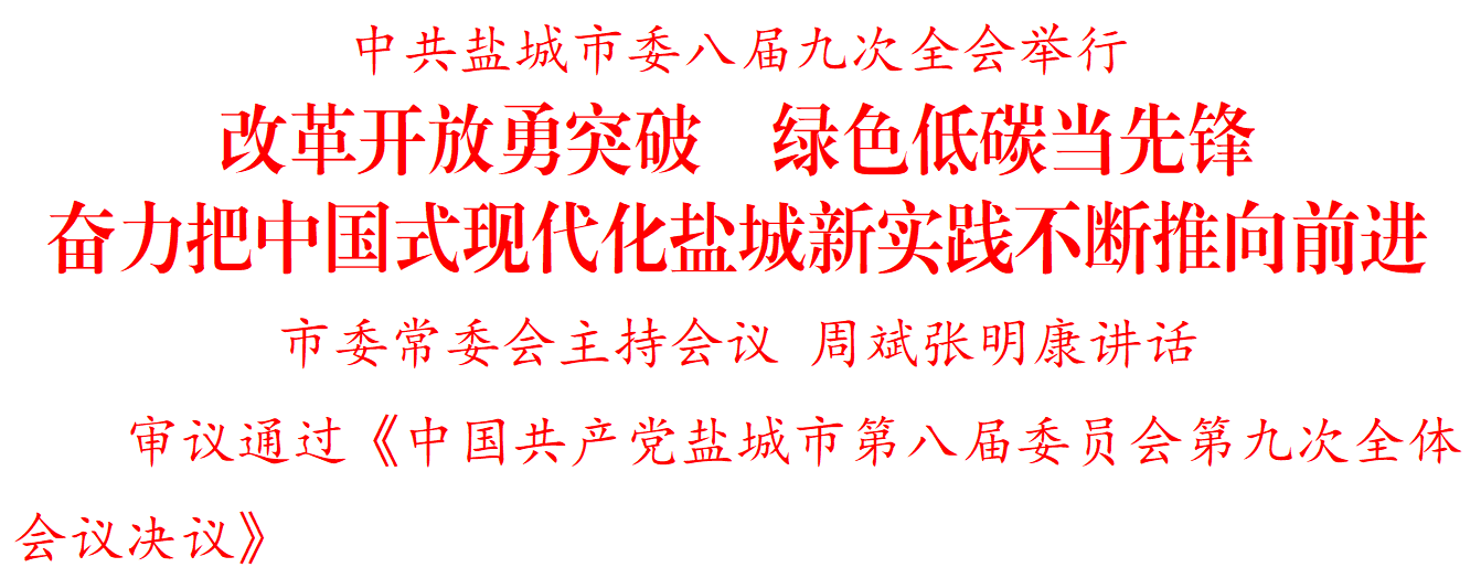 全會審議通過《中國共產黨鹽城市第八屆委員會第九次全體會議決議》,審議了《中共鹽城市委常委會2024年度工作情況報告》《中共鹽城市委常委會2024年度落實全面從嚴治黨主體責任情況報告》。