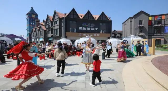 男女群舞《西域風鼓》,讓人仿佛置身蒼茫西域,舞者身披華服翩然旋轉,絢麗的裙擺與港區交相輝映,引得現場觀眾紛紛舉起手機記錄這一絕美畫面。