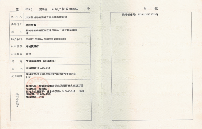 此次海域使用證的獲批,標志著濱海港區(qū)北區(qū)通用碼頭三期工程在建設進程中邁出了堅實一步,也為鹽城港的發(fā)展注入了新活力,助力其在區(qū)域經(jīng)濟發(fā)展中發(fā)揮更大作用。
