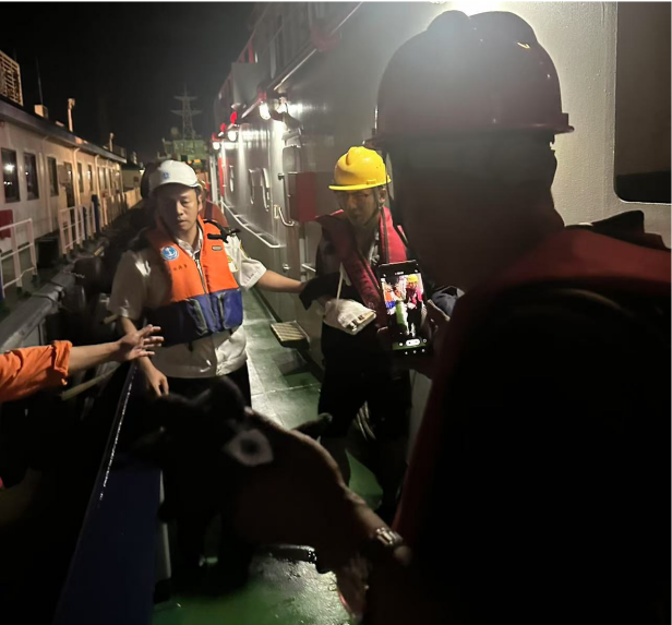 第一時(shí)間,“黃海拖06”輪全體船員迅速就位,整裝待發(fā)。當(dāng)晚正值臺(tái)風(fēng),惡劣天氣令視線模糊、航行艱難。但船長沉穩(wěn)果敢,憑借豐富的經(jīng)驗(yàn)與嫻熟的技術(shù),依托先進(jìn)設(shè)備和精準(zhǔn)導(dǎo)航,克服了海上復(fù)雜的氣象條件和航行風(fēng)險(xiǎn),謹(jǐn)慎把控航向與速度,駕馭拖輪沖破風(fēng)浪,直撲航行于濱海港區(qū)附近的“海鑫成”輪。航行途中,船員們分工明確、協(xié)同作戰(zhàn),密切監(jiān)控海況與船舶動(dòng)態(tài),及時(shí)調(diào)整策略保障航行安全,以高度的專業(yè)素養(yǎng)和使命感,于波濤洶涌間開辟出一條安全通道,成功將受傷船員轉(zhuǎn)移到拖輪上。