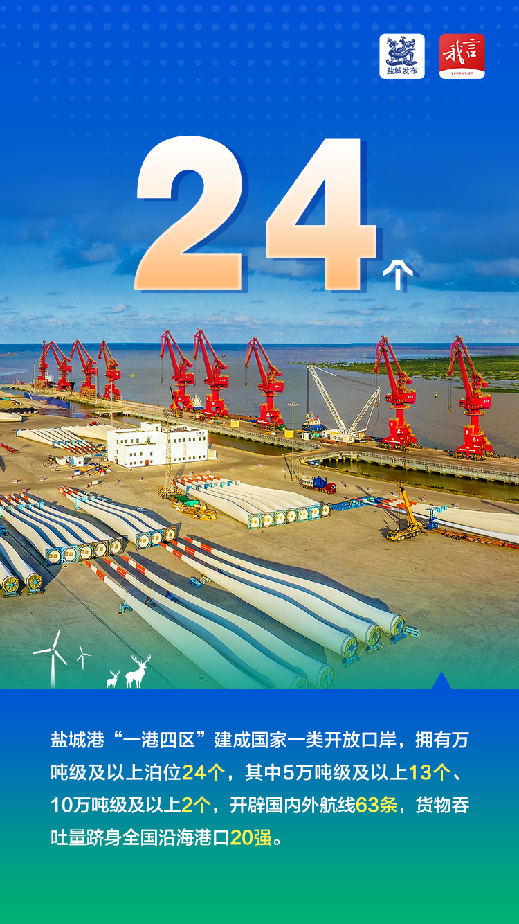 5年來,鹽城港“一港四區”建成國家一類開放口岸,擁有萬噸級及以上泊位24個,其中5萬噸級及以上13個、10萬噸級及以上2個,開辟國內外航線63條,貨物吞吐量躋身全國沿海港口20強。