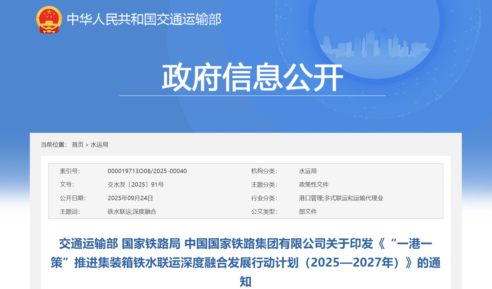 為深入貫徹落實黨中央、國務院決策部署,優化調整運輸結構,進一步發揮綜合運輸優勢,促進有效降低全社會物流成本,現將《“一港一策”推進集裝箱鐵水聯運深度融合發展行動計劃(2025—2027年)》印發給你們,請認真抓好落實。