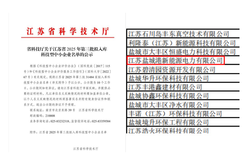 近日,經(jīng)相關部門嚴格評審,江蘇鹽城港新能源電力有限公司憑借在新能源電力領域的技術創(chuàng)新能力、良好的發(fā)展?jié)摿Γ晒θ脒x科技型中小企業(yè)信息庫。這標志著公司在科技創(chuàng)新與發(fā)展方面邁上了新臺階。