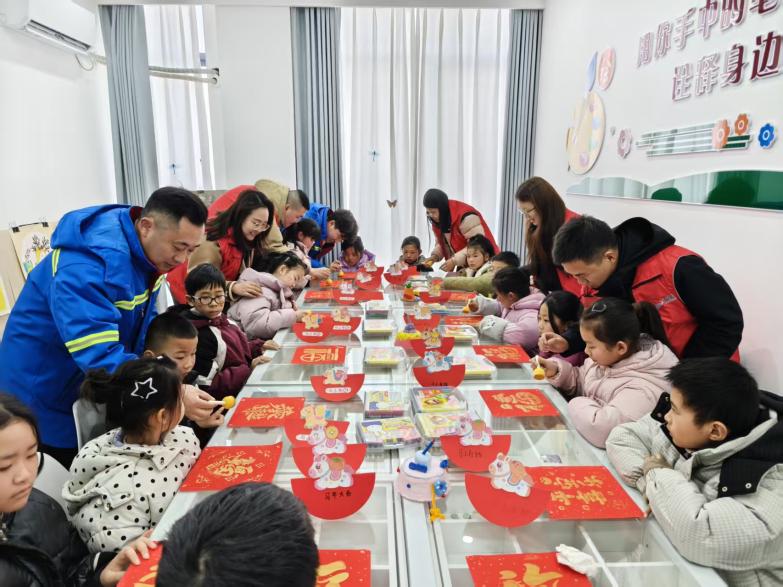 活動當日下午,在陳家港鎮未成年人保護工作站的圖書室里,20名留守兒童在志愿者的陪伴下認真閱讀課外書籍,沉浸在書香之中。隨后的游戲環節里,志愿者們與孩子們玩起擊鼓傳玩具的游戲,音樂聲時而急促、時而舒緩,每當鼓聲停下,拿到玩具的孩子便大方地說出一個帶“馬”字的四字詞語,現場歡聲笑語不斷。在手工制作室,孩子們在志愿者的耐心指導下,動手粘貼馬年玩具,并親手拓印出金光閃閃的“?!弊?,感受傳統文化的魅力。活動最后,響水港區志愿者們為孩子們發放了新年禮品和壓歲紅包,送上滿滿的新春祝福。