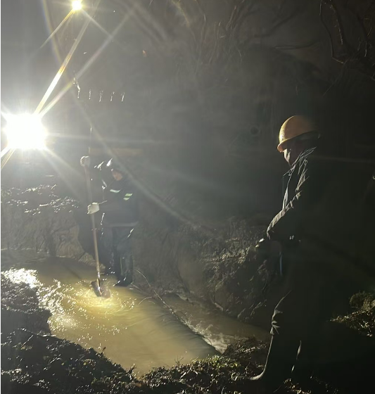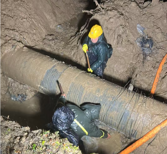現場指揮與技術人員冒雨研討,迅速優化施工方案,確保各環節無縫銜接。挖機轟鳴聲中,搶修隊員跳進齊膝深的泥漿中,摸索著查找漏點;暴雨如注的深夜里,照明燈下一個個躬身忙碌的身影,成了雨幕中最堅實的剪影。從傍晚到深夜,從大雨滂沱到雨勢漸歇,8個小時的連續奮戰,他們未曾合眼、未曾停歇。