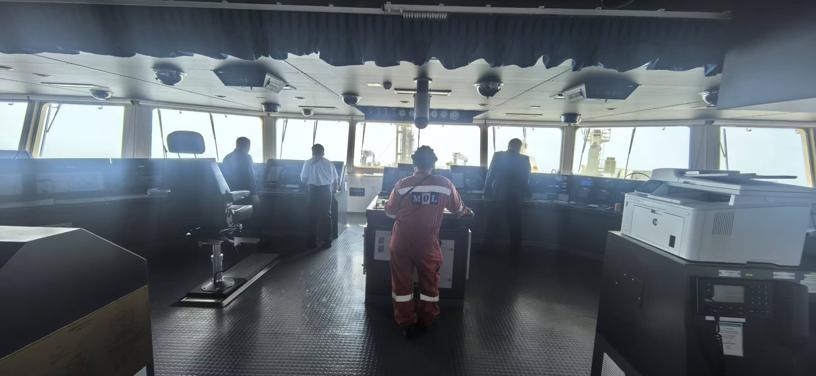 從舷側視角可見,“綠能風”輪龐大的主甲板與錯綜復雜的管道系統(tǒng)在薄霧中若隱若現(xiàn),甲板上工作人員嚴陣以待,隨時應對突發(fā)狀況。駕駛室內(nèi),三名引航員專注操作,與外籍船長及駕駛團隊默契配合,完成一系列高難度操縱動作。與此同時,護航拖輪在周圍穩(wěn)穩(wěn)跟隨,為巨輪提供應急推力支持,構成一幅現(xiàn)代港口高效協(xié)作的生動畫卷。