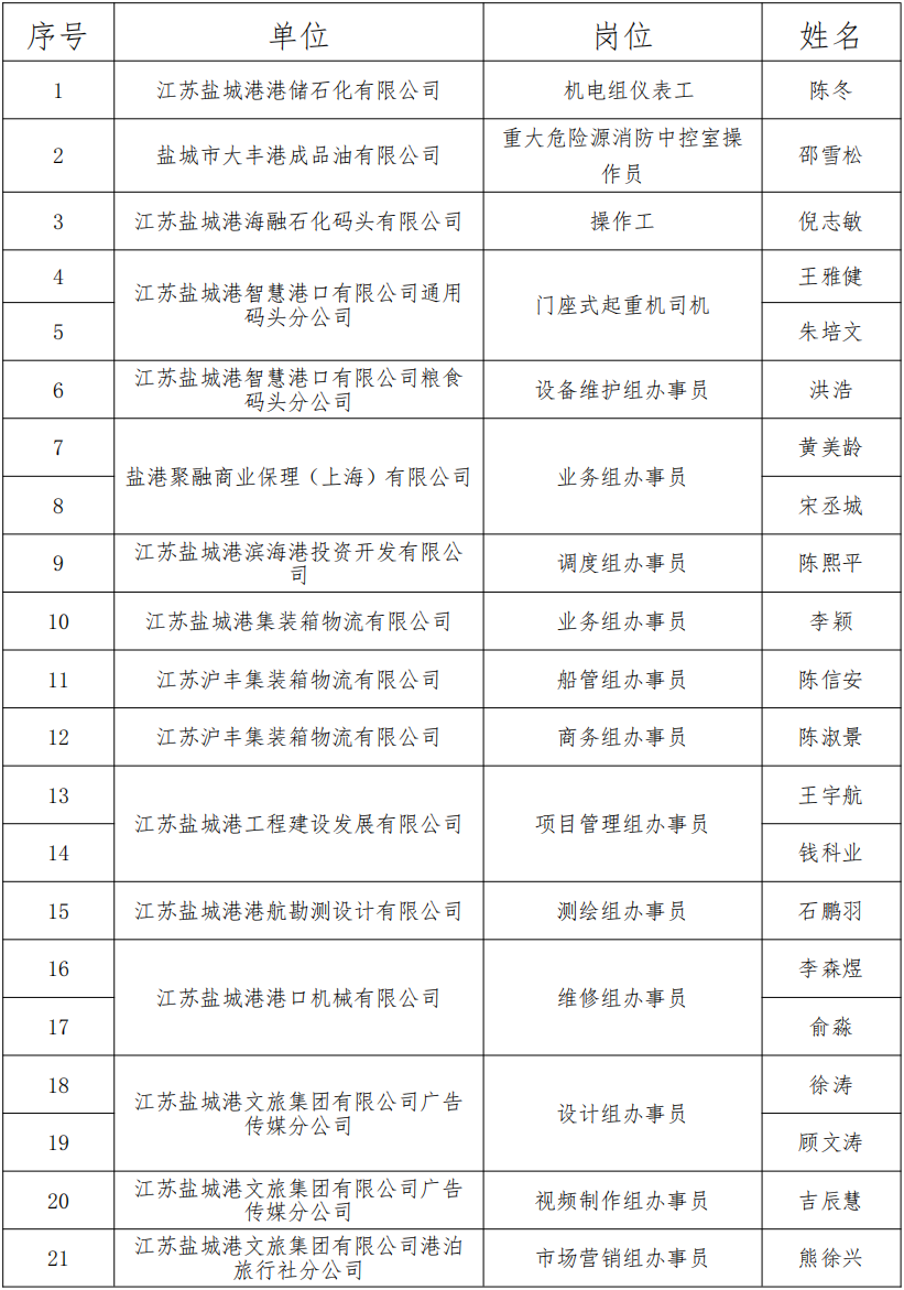 根據(jù)2024年7月7日發(fā)布的《江蘇鹽城港控股集團(tuán)有限公司招聘公告》相關(guān)程序規(guī)定,現(xiàn)對24名擬錄用工作人員進(jìn)行公示(另外江蘇鹽城港拖輪服務(wù)有限公司船管組辦事員崗位擬聘人員均自愿放棄)。