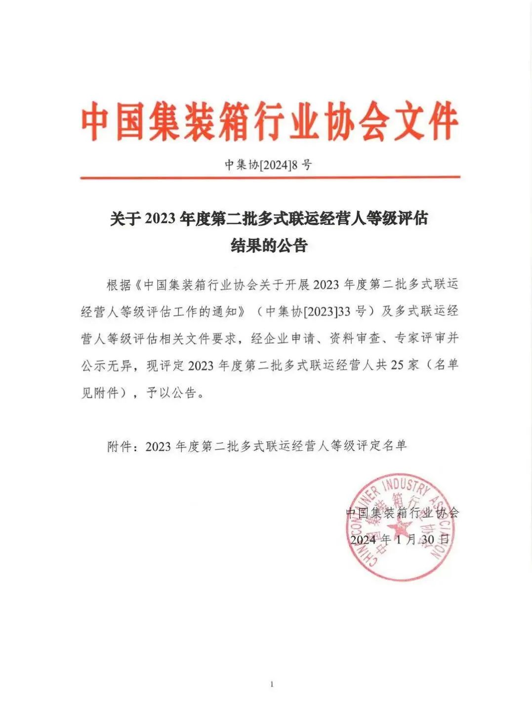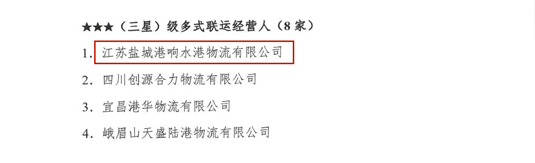 近日,中國集裝箱行業協會發布2023年度第二批多式聯運經營人等級評定名單,江蘇鹽城港響水港物流有限公司獲得“三星級多式聯運經營人”稱號。