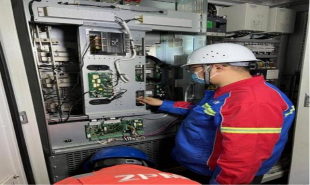 2023年5月,移機準備為兩條船只靠泊時,疑似一臺門機變頻器故障,控制合無法啟動。碼頭作業人員對接售后單位,通過電話指導排查故障源點時卻遲遲找不到根源,漫長的等待時刻影響著碼頭的正常作業進程。信息反饋至設備管理中心,“吉祥”班組經過現場排查很快找到“病因”,12分鐘成功解決變頻器的故障,使之正常運轉。