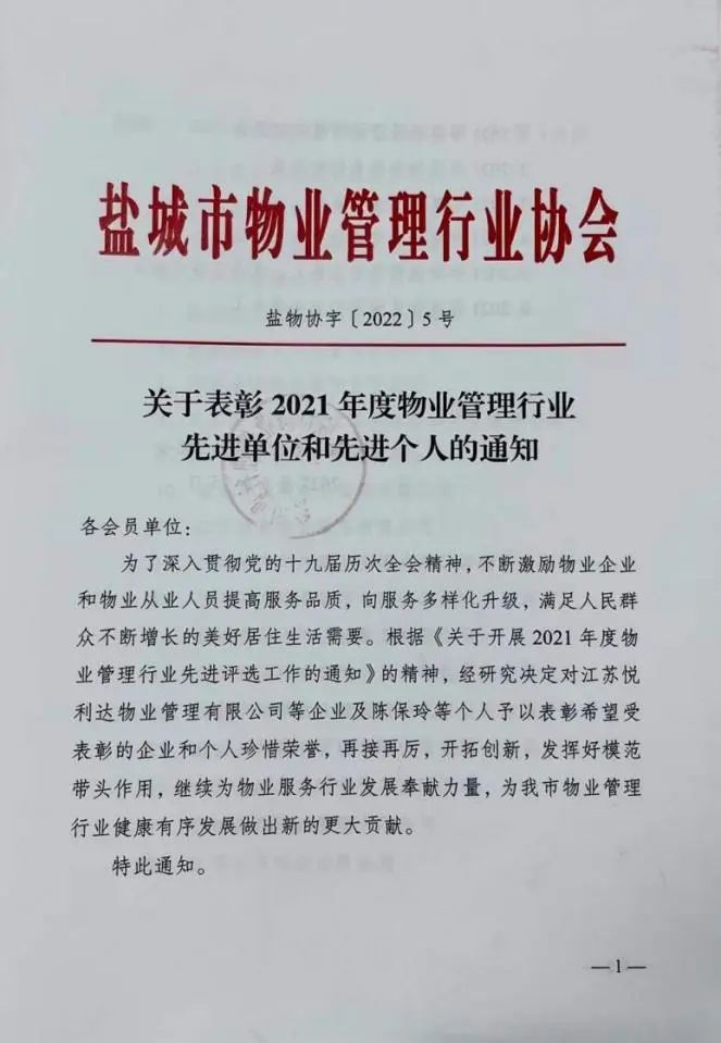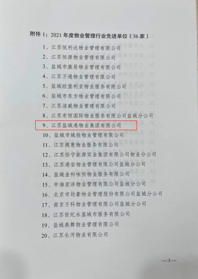 近日,鹽城市物業(yè)管理行業(yè)協(xié)會(huì)對(duì)全市物業(yè)管理行業(yè)先進(jìn)單位和先進(jìn)個(gè)人進(jìn)行了表彰,江蘇鹽城港物業(yè)集團(tuán)有限公司獲評(píng)“2021年度物業(yè)管理行業(yè)先進(jìn)單位”榮譽(yù)稱號(hào)。