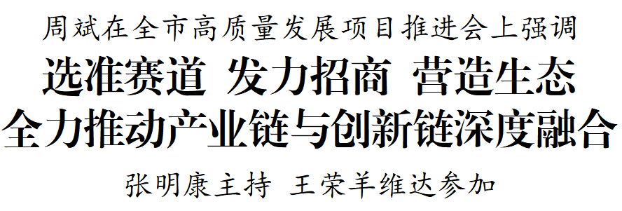 5月24日至25日,全市高質量發展項目推進會召開。市委書記周斌出席并講話。他強調,要深入學習貫徹習近平新時代中國特色社會主義思想,全面落實“四個走在前”重大任務,加快推動產業鏈與創新鏈深度融合,以科技創新支撐引領經濟高質量發展,努力推動經濟運行率先整體好轉,為競逐新賽道、勇當排頭兵注入強大動能。市委副書記、代市長張明康主持會議,市人大常委會主任王榮,市委副書記、統戰部部長羊維達參加。