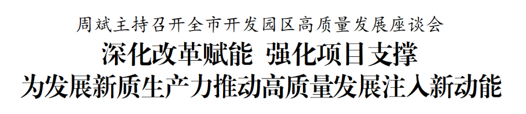 4月22日,市委書記周斌主持召開全市開發(fā)園區(qū)高質(zhì)量發(fā)展座談會,聽取情況匯報(bào),研究分析問題,部署落實(shí)工作。他強(qiáng)調(diào),要認(rèn)真學(xué)習(xí)貫徹習(xí)近平總書記重要講話重要指示精神,完整準(zhǔn)確全面貫徹新發(fā)展理念,按照省委決策部署,緊緊圍繞發(fā)展新質(zhì)生產(chǎn)力,用好改革關(guān)鍵一招,加大科技創(chuàng)新力度,強(qiáng)化重大產(chǎn)業(yè)項(xiàng)目支撐,努力為全市高質(zhì)量發(fā)展注入新動能。