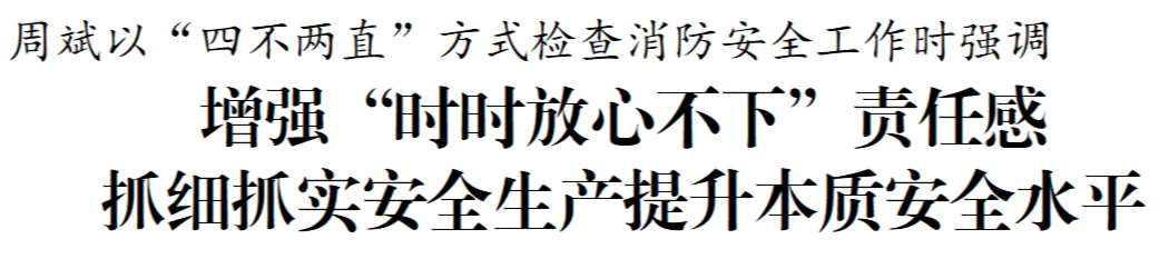 6月27日下午,市委書記周斌以“四不兩直”方式檢查消防安全工作。他強調(diào),要深入學習貫徹習近平總書記關于安全生產(chǎn)和消防工作的重要論述,按照省市委部署要求,時刻繃緊安全生產(chǎn)這根弦,增強“時時放心不下”的責任感和“事事心中有底”的行動力,抓實抓細隱患排查整治,壓緊壓實各方責任,全面筑牢安全防線,切實維護人民群眾生命財產(chǎn)安全。