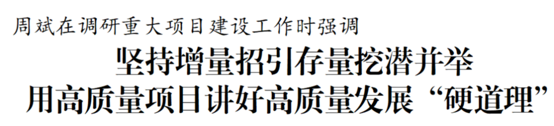 周斌在調(diào)研中強(qiáng)調(diào),重大項(xiàng)目是經(jīng)濟(jì)社會高質(zhì)量發(fā)展的“加速器”和“壓艙石”。今年各項(xiàng)工作已經(jīng)進(jìn)入下半場,各地各部門要增強(qiáng)時(shí)不我待的緊迫感,堅(jiān)持一切圍著項(xiàng)目轉(zhuǎn)、一切盯著項(xiàng)目干,推動重大項(xiàng)目建設(shè)跑出“加速度”,用高質(zhì)量項(xiàng)目講好高質(zhì)量發(fā)展“硬道理”。要堅(jiān)持增量招引和存量挖潛并舉,既注重招引新項(xiàng)目、好項(xiàng)目,又鼓勵引導(dǎo)現(xiàn)有企業(yè)開展“智改數(shù)轉(zhuǎn)網(wǎng)聯(lián)”、技改擴(kuò)能項(xiàng)目投資。要積極推動制造業(yè)數(shù)字化轉(zhuǎn)型,促進(jìn)專精特新企業(yè)蓬勃發(fā)展,培育壯大智能產(chǎn)業(yè),加快構(gòu)建現(xiàn)代化產(chǎn)業(yè)體系,為推進(jìn)中國式現(xiàn)代化鹽城新實(shí)踐提供堅(jiān)實(shí)支撐。