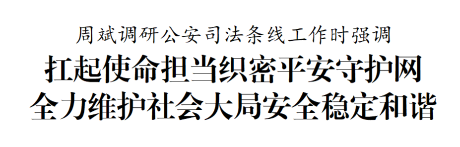 在調研中,周斌指出,公安司法條線是維護社會穩(wěn)定的“主力軍”、服務高質量發(fā)展的“護航員”。要突出政治引領,服務發(fā)展大局,圍繞優(yōu)化營商環(huán)境、護航產業(yè)發(fā)展、保障民生福祉等中心任務,找準工作切入點和發(fā)力點,為高質量發(fā)展提供堅強法治保障。要深化社會治理,堅持和發(fā)展新時代“楓橋經(jīng)驗”,完善網(wǎng)格化管理、精細化服務、信息化支撐的基層治理平臺,提升社會治理現(xiàn)代化水平。要堅守人民立場,聚焦群眾“急難愁盼”,扎實推進平安建設、掃黑除惡、未成年人保護等工作,不斷增強人民群眾的獲得感、幸福感、安全感。