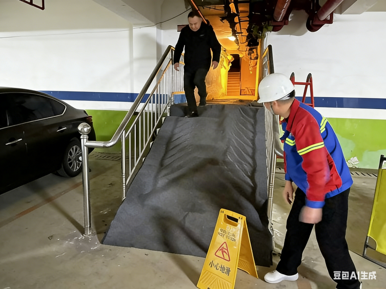 險(xiǎn)情就是命令,處置刻不容緩。搶險(xiǎn)人員攜專業(yè)搶修工具、備用管材火速進(jìn)場,與現(xiàn)場協(xié)調(diào)組實(shí)現(xiàn)無縫銜接。為防范業(yè)主滑倒受傷,工作人員規(guī)范鋪設(shè)防滑警示帶與防滑地毯,醒目設(shè)置安全標(biāo)識(shí),有序引導(dǎo)人流繞行;搶險(xiǎn)組依據(jù)消防管網(wǎng)分布圖精準(zhǔn)定位閥門,果斷執(zhí)行分區(qū)關(guān)閥止水操作,迅速切斷漏水源頭,有效遏制險(xiǎn)情進(jìn)一步蔓延。