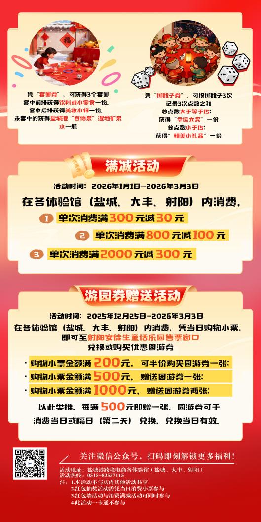 買年貨的同時(shí),別忘為親子時(shí)光添份樂趣!活動(dòng)期間,憑當(dāng)日購物小票即可前往射陽安徒生童話樂園兌換專屬游園優(yōu)惠。單筆消費(fèi)滿500元即贈(zèng)游園券1張,多買多贈(zèng),讓童話世界的歡聲笑語,成為這個(gè)新年最溫暖的記憶。