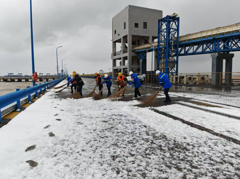 智慧港口公司迅速成立專項清雪除冰突擊隊,備足融雪劑、防滑墊等應急物資,采取“人工輔助、循環作業”模式,干部職工頂風冒雪清掃碼頭棧橋主干道,對邊角縫隙、臺階坡道等機械作業盲區逐一清除積冰。黨員干部扎根一線,加大巡查頻次,在關鍵路段鋪設防滑設施、噴灑融雪劑,實時排查安全隱患,操作人員嚴格遵守作業規范,穿戴防滑鞋、反光背心等防護用品,嚴守降速穩行要求,切實將“冬季五防”要求落到實處。